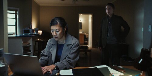 Claire Danes y Hettienne Park aparecen en una imagen del episodio 1x06 de la serie 'The Beast in Me', la serie de televisión de Netflix.