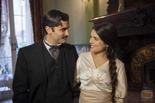 Los actores Adriana Ugarte y Alex Garía, que interpretan a los personajes principales, mirándose a los ojos y demostrando la química que tienen.