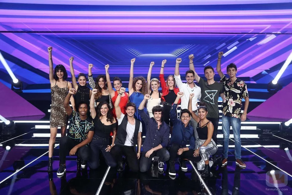 Los concursantes al completo de la edición de 2018 de 'Operación Triunfo' posaron haciendo el particular gesto del concurso posando en formación durante la Gala 2.
