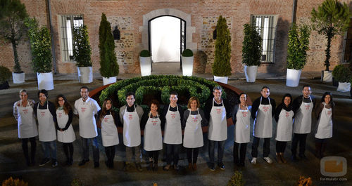 Los aspirantes posan junto a sus delantales blancos en la conocida entrada.