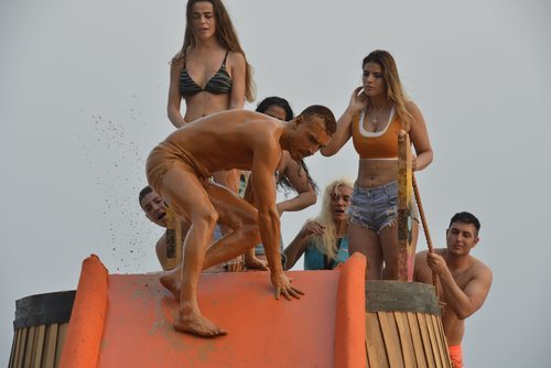 Los concursantes se tiran por el tobogán para meterse en el barro y almacenar en el cubo la mayor cantidad posible de este líquido en la Gala 1 de 'Supervivientes 2019'.