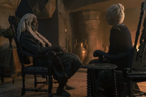 Corlys Velaryon y Rhaenys Targaryen conversan en 'La Casa del Dragón'