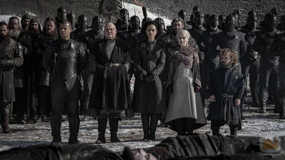 La aspirante a Reina de Poniente da su último adiós a sus guerreros caídos en la gran batalla del capítulo anterior rodeado de su equipo de gobierno.