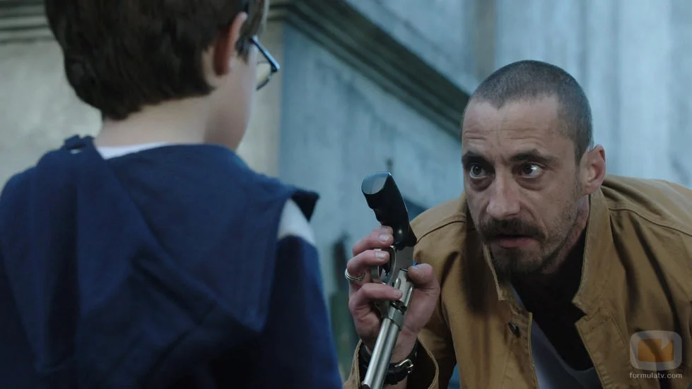 (1x03) Crespo, interpretado por Ismael Martinez le enseña al pequeño del grupo Dani (Álvaro Balas) un arma para que así pueda defenderse