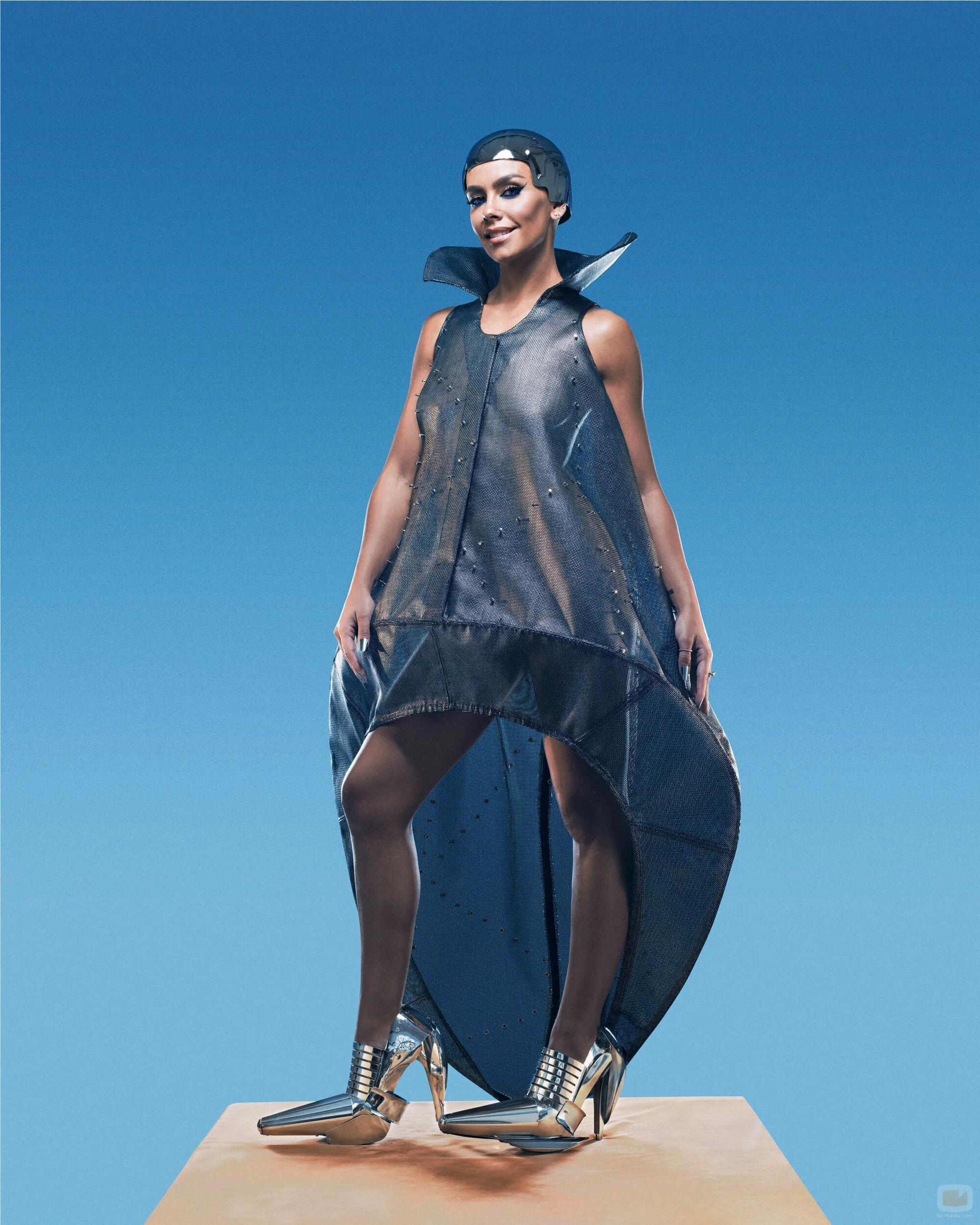 La presentadora apuesta por un histórico diseño de Manuel Piña, que tiene un diseño transparente con acabados metálicos y dos aros que aportan volumen geométrico a su estilismo.