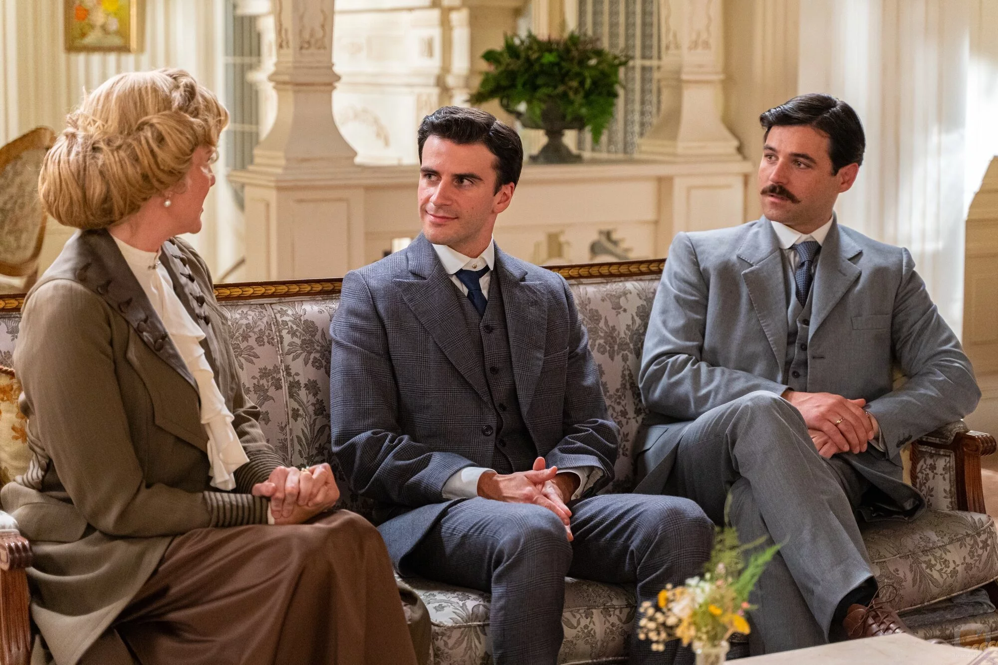Cruz Ezquerdo, Abel Bueno y Manuel Luján charlan sentados en el sofá de la casa de los Luján en la serie 'La promesa'.