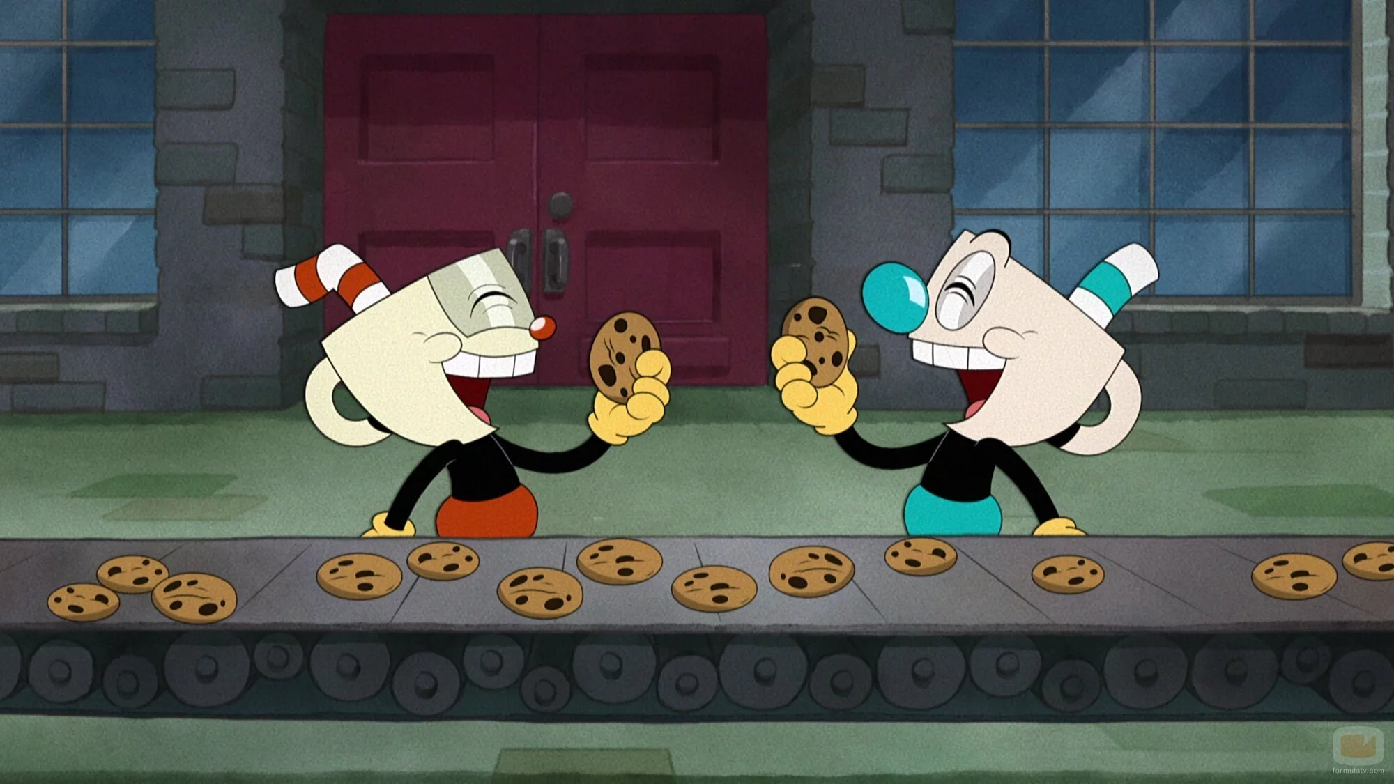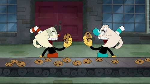 Los personajes de '¡La serie de Cuphead!' de Netflix, Cuphead y Mugman, comen cookies en un fotograma de la serie basada en el famoso videojuego.