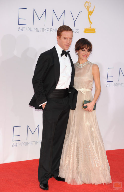 El actor Damian Lewis, el sargento Brody en 'Homeland', posa con su mujer Helen McCrory en la alfombra roja de la 64 edición de los Premios Emmy en Los Ángeles.
