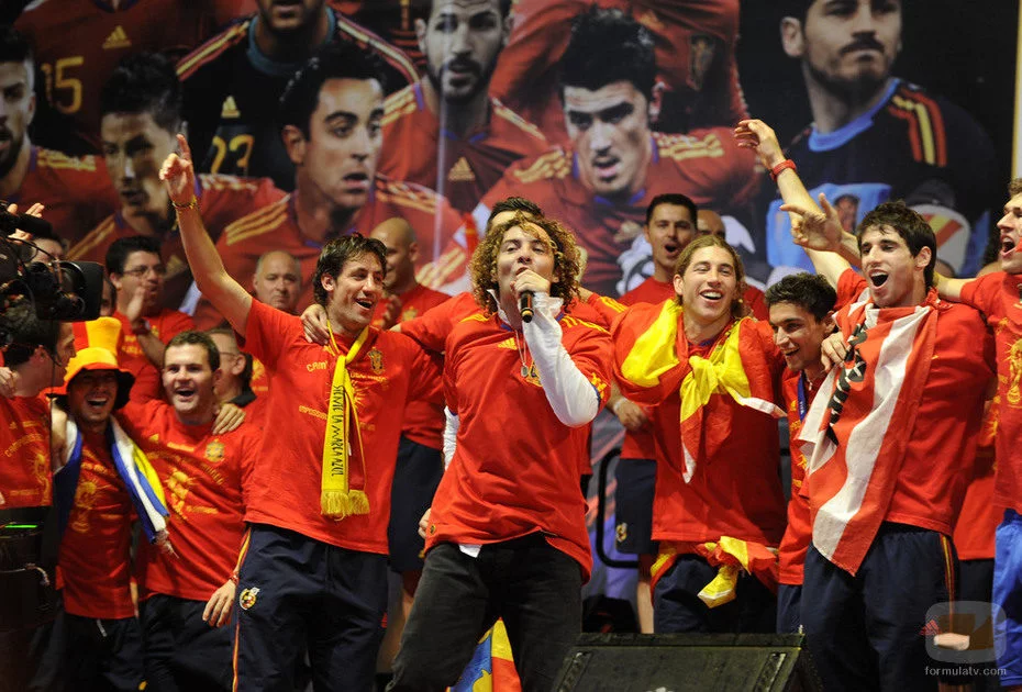 La Selección Española junto a David Bisbal durante la celebración de España como Campeona del Mundo en Madrid.
