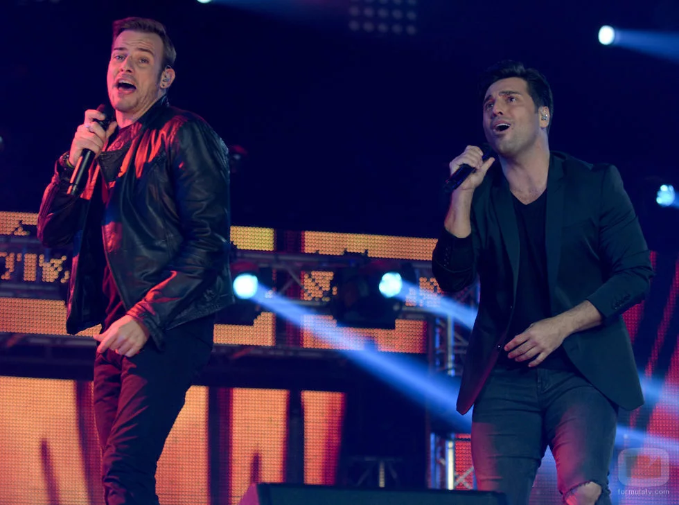 El cantante cántabro junto con el catalán interpretan "Dos hombres y un destino" durante el concierto de 'OT. El reencuentro'.