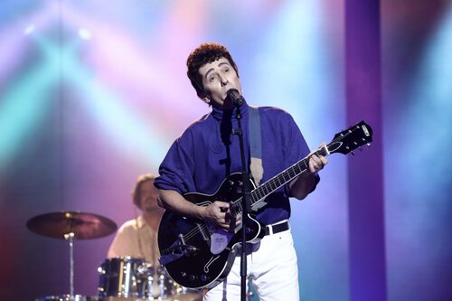 David Fernández, concursante de 'Tu cara me suena 9', programa producido por Gestmusic y emitido en Antena 3, imita a Gabinete Caligari y su "La sangre de tu tristeza".