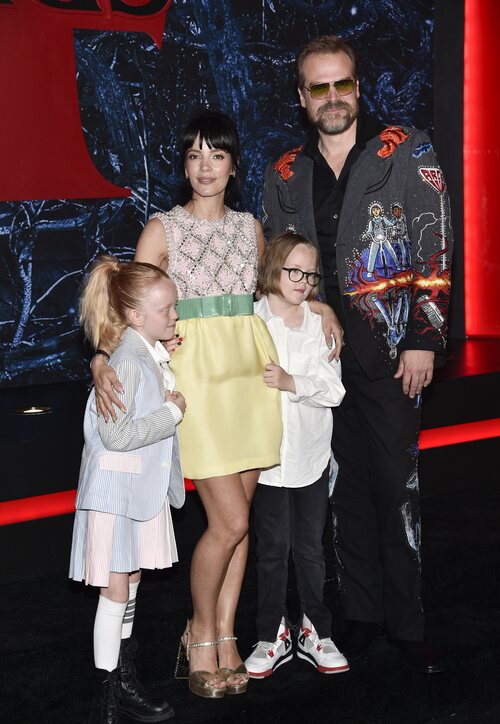 David Harbour, Lily Allen y sus hijos en estreno de 'Stranger Things 4'.