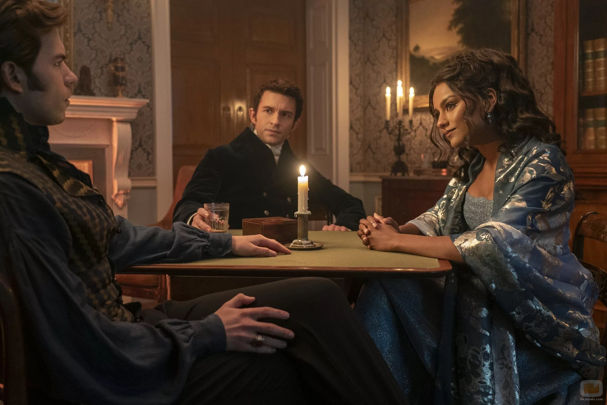 Jonathan Bailey, Simone Ashley y Luke Newton aparecen en una escena promocional del capítulo 'De la mano' de 'Bridgerton'.