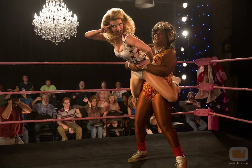 Debbie Eagan y Tomme Dawson actúan disfrazadas en en escenario del show 'GLOW' en una escena de la segunda temporada.