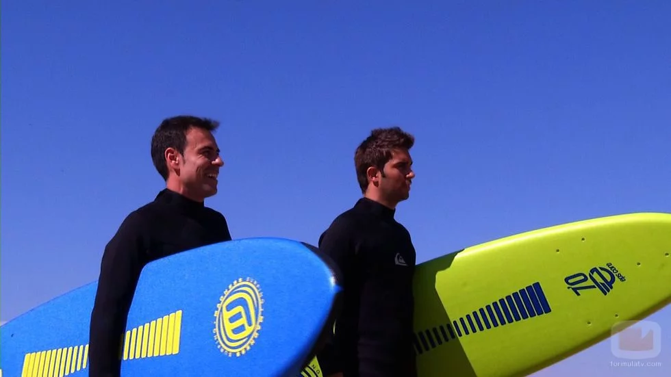 Los periodistas deportivos de 13tv posan con tablas de surf durante la grabación de la promo veraniega del canal.