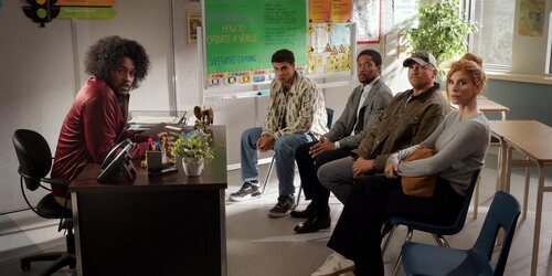 Jesse Lipscombe, Kolton Stewart, Sarah Rafferty y Marc Blucas aparecen en una foto del episodio 2x06 de la serie 'Mi vida con los chicos Walter'.