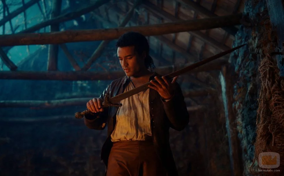 El actor californiano sostiene la espada Excálibur en 'Maldita', la revisión de la leyenda artúrica en Netflix.
