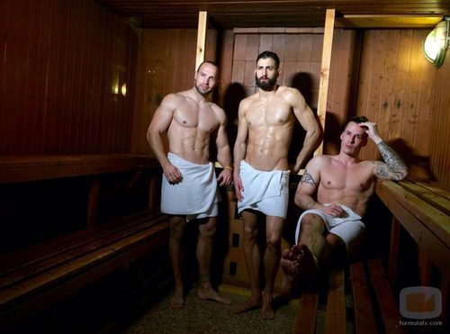 Ramiro (que se pasó al equipo de Marta en el momento de su expulsión) y Diego y David (del equipo de Rym) posan muy sugerentes en una sauna.