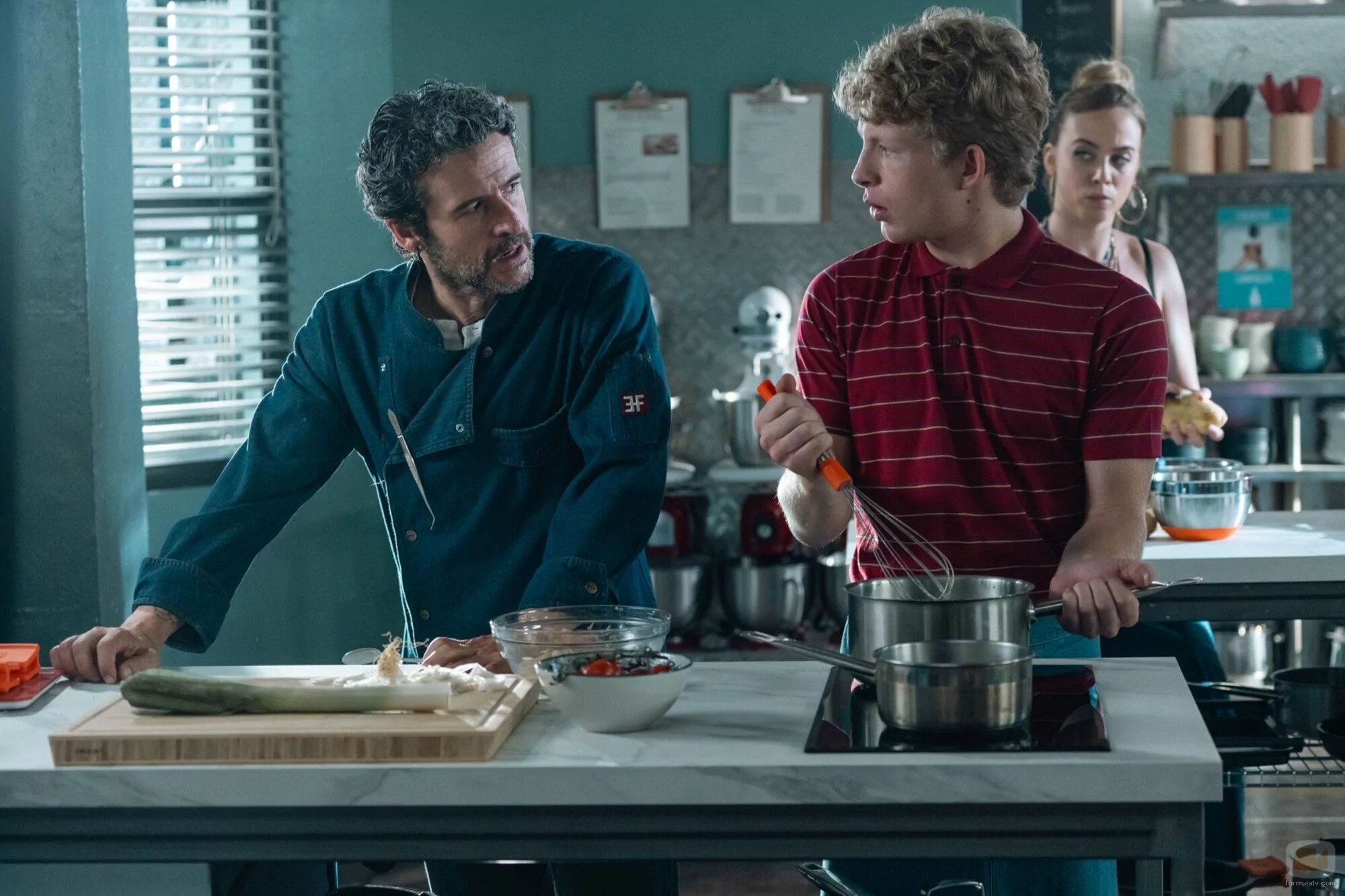 Tadeo Masó y Diego Martín aparecen en una imagen del capítulo 'Arroz mar y montaña con sepia, secreto ibérico y piparras' de la serie 'Sin gluten'.