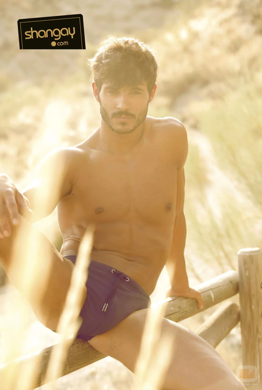 El actor luce un bañador azul y posa en medio de una zona costera plagada de arena y pajas que transmiten calidez en la nueva sesión de fotos de la revista Shangay.
