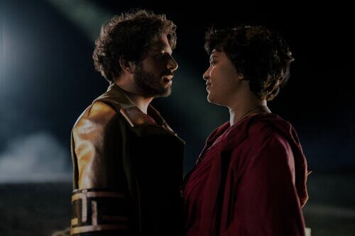 Isabella Laughland y Dimitri Leonidas aparecen en una escena promocional del episodio 'Donde las estrellas son más escasas' de la serie 'Foundation'.