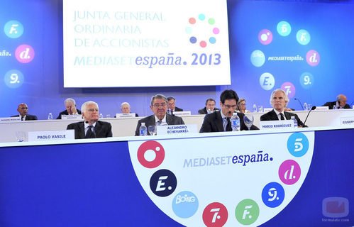 Paolo Vasile y Giuseppe Tringali, consejeros delegados; Alejandro Echevarría, presidente, y Mario Rodríguez, responsable de la asesoría jurídica y director general corporativo del grupo, detallan a los accionistas los resultados económicos de la compañía audiovisual.