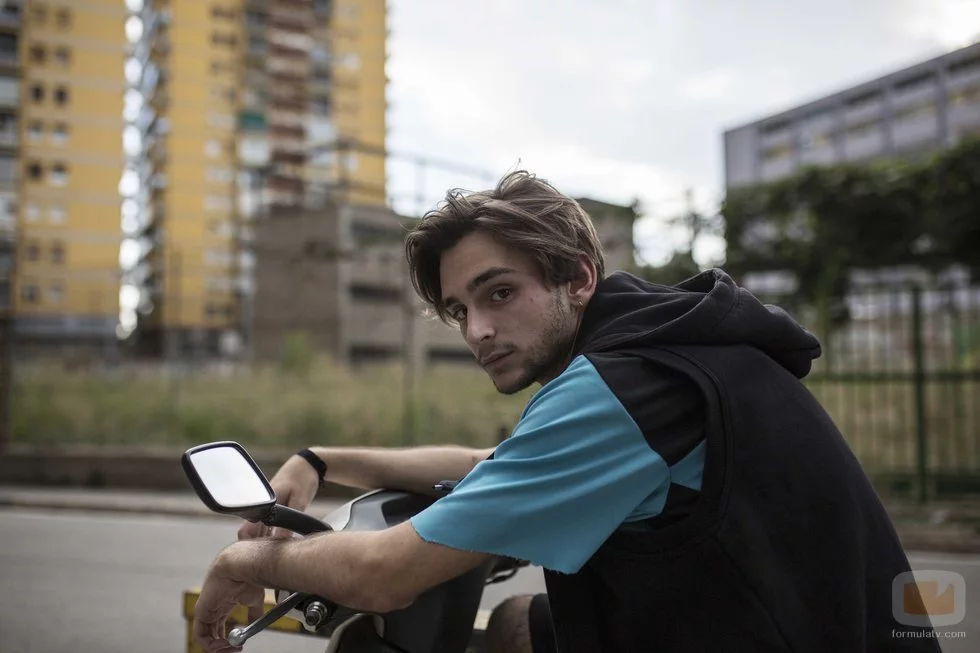 El actor Guillermo Campra da vida al personaje de DJ Lu en la serie 'Boca Norte'. En la imagen, aparece subido en una bicicleta en un barrio de Barcelona donde transcurre la trama.