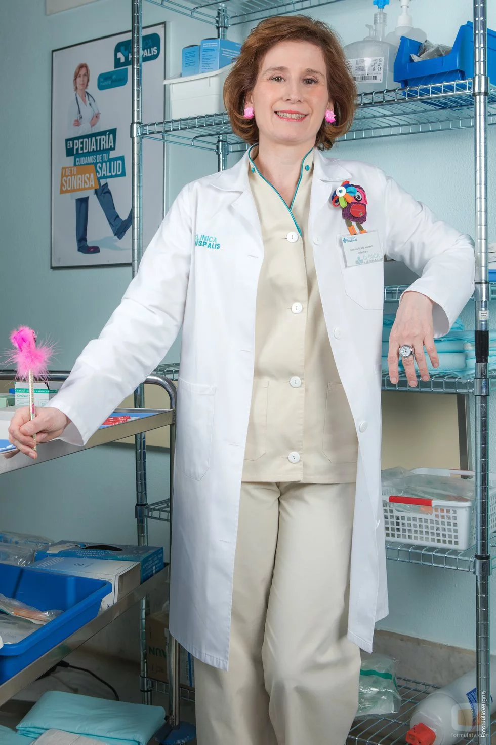 Mari Paz Sayago es Dolores, la cotilla y mejor amiga de Carmen, María León, en la ficción de Antena 3.