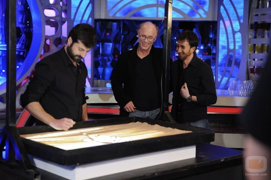 El actor presencia los dibujos realizados sobre la arena.