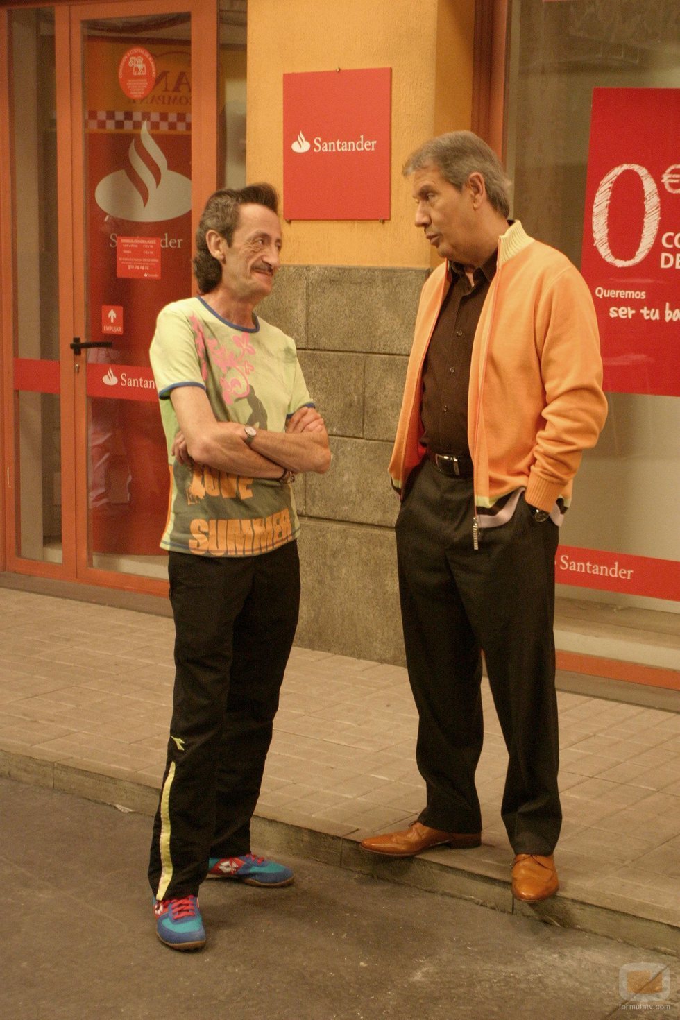 Mariano (Eduardo Gómez) y Rafael (Nicolás Dueñas) frente al portal de Desengaño 21 en la ficción de Atresmedia.