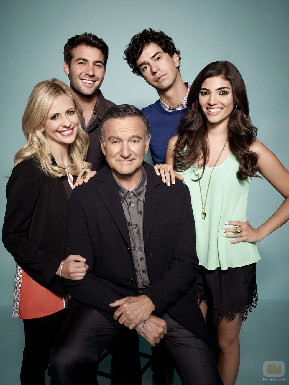 Los protagonistas Robin Williams y Sarah Michelle Gellar junto al resto del equipo formado por Jimmy Wolk, Hamish Linklater, Amanda Setton.