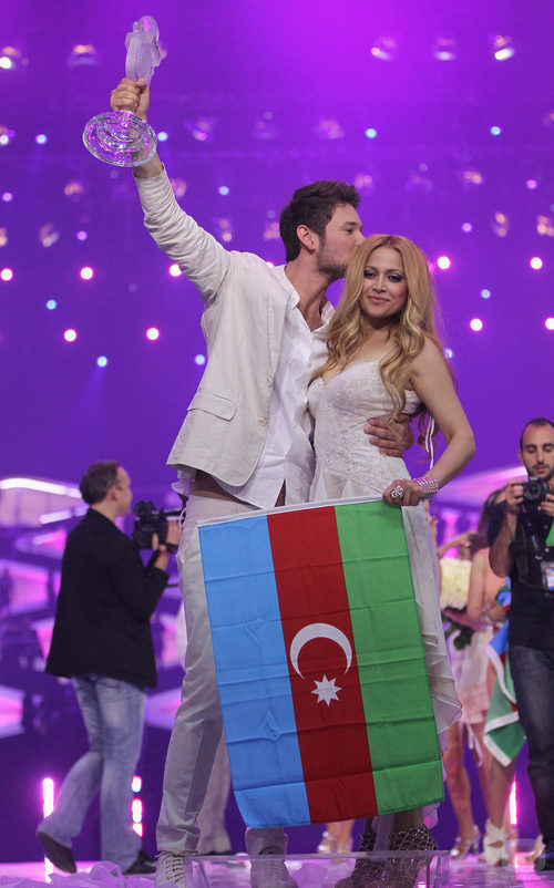 Los representantes de Azerbaiyán se besan tras ganar el Festival de la Canción.