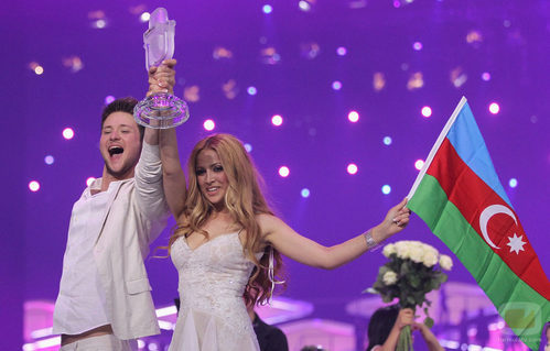 Los ganadores del Festival de Eurovisión 2011, Nigar Jamal y Eldar Gazimov, con el trofeo de la victoria.