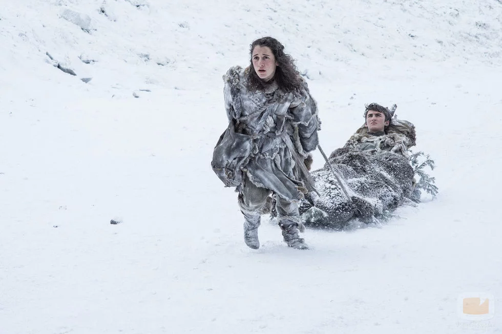 Meera Reed arrastrando a Bran Stark por la nieve en una secuencia de la 7ª temporada de la serie 'Game of Thrones'.