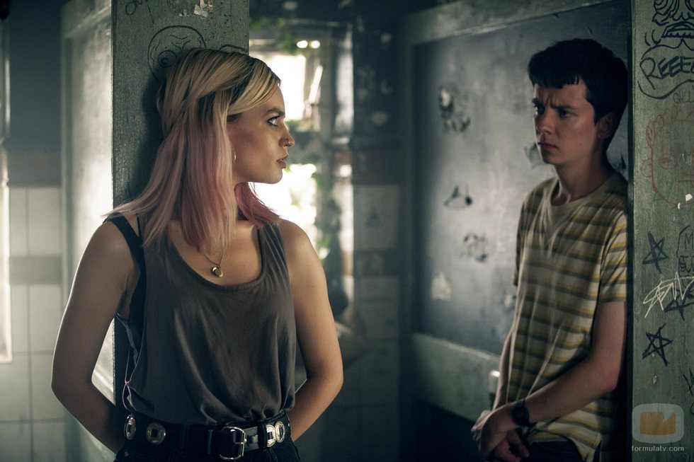 Emma Mackey y Asa Butterfield en el lugar abandonado en 'Sex education'