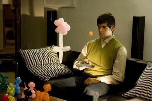 Miguel Ángel Muñoz, rodeado de globos con forma de perros, mira la televisión en 'Operación mala hierba' de la serie 'Cazadores de hombres'.