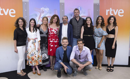 Todo el equipo de actores posa para la foto de grupo de la nueva serie de La1 'La Pelu' en la que se verá el día a día de una peluquería.