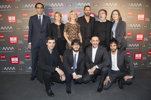 Buena parte del equipo de 'El Ministerio de el Tiempo' entre los que se encuentran los actores Cayetana Guillén Cuervo, Hugo Silva y Nacho Fresneda, posan junto al creador de la serie Javier Olivares en los Premios MiM 2016.
