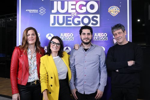 Parte del equipo directivo del programa 'Juego de juegos' formado por Carmen Ferreiro (directora de entretenimiento de Atresmedia), Pablo Abelenda (productor ejecutivo del programa) y Jordi Rosell (director del programa) junto a la presentadora y conocida actriz Silvia Abril.