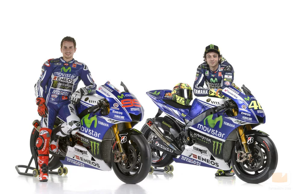 Los pilotos Jorge Lorenzo y Valentino Rossi posan con los colores y las motos de esta temporada.