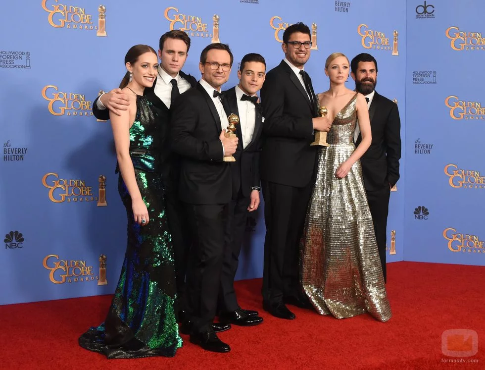 El equipo de 'Mr. Robot' posa orgulloso ante los fotógrafos acreditados con el Globo de Oro como mejor serie dramática.