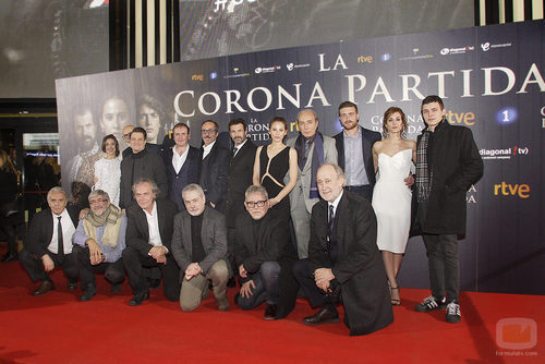 Los actores, productores y director de la película 'La corona partida' acudieron a la presentación de la misma en los cines Capitol en Gran Vía, Madrid, donde posaron juntos.
