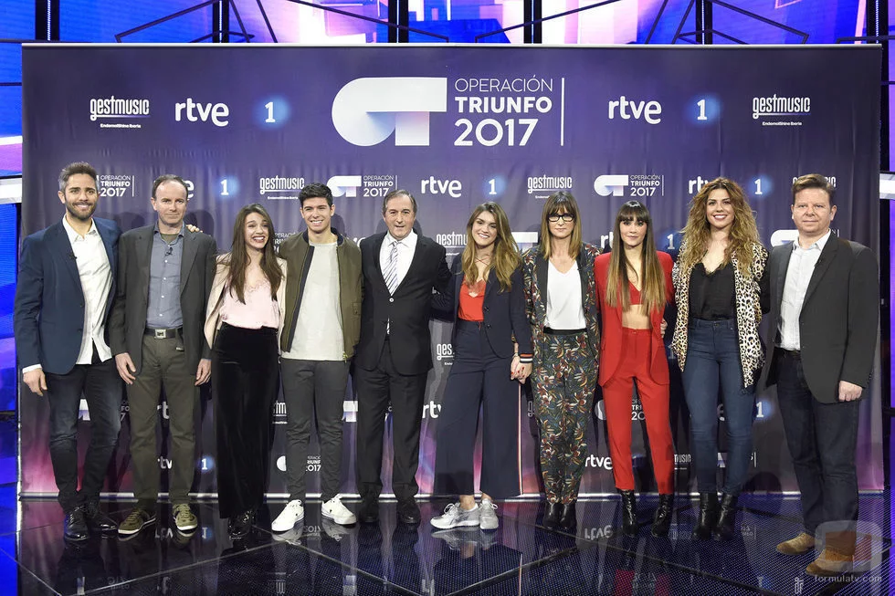 Roberto Leal, Eladio Jareño, Noemí Galera, Tinet Rubira y Toni Sevilla posan con los finalistas de 'OT 2017'