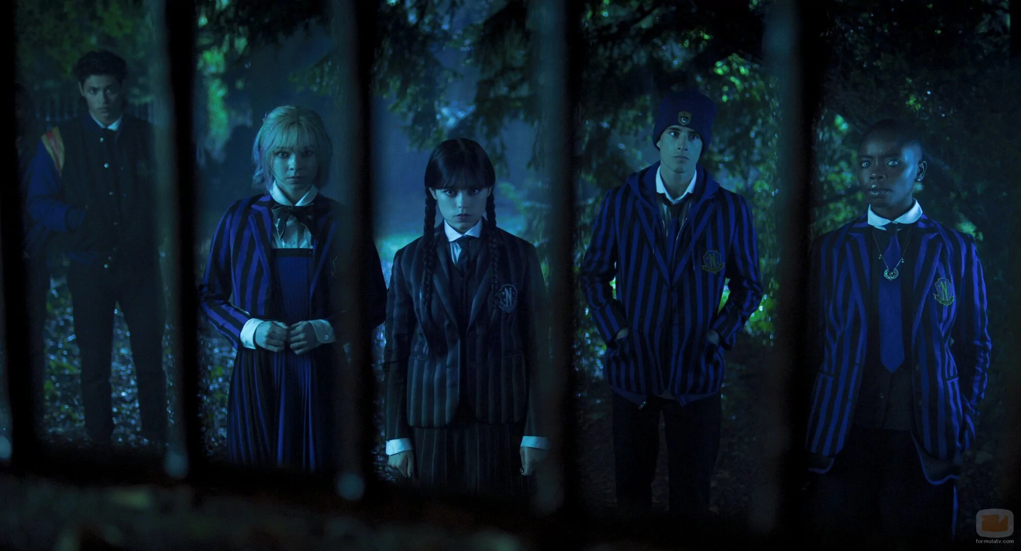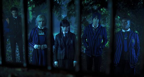 Joy Sunday, Jenna Ortega, Georgie Farmer y Emma Myers aparecen en una foto del capítulo 'El Hyde y la triste persecución' de la serie 'Wednesday'.