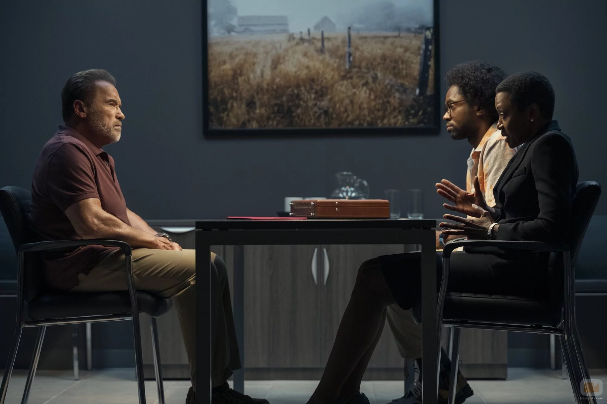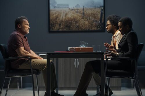 Arnold Schwarzenegger, Barbara Eve Harris y Milan Carter aparecen en una foto promocional del episodio 'Asalto a un tren' de la serie 'FUBAR'.