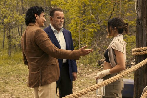 Monica Barbaro, Gabriel Luna y Arnold Schwarzenegger aparecen en una escena promocional del capítulo 'De tal padre tal hija' de la serie 'Fubar'.