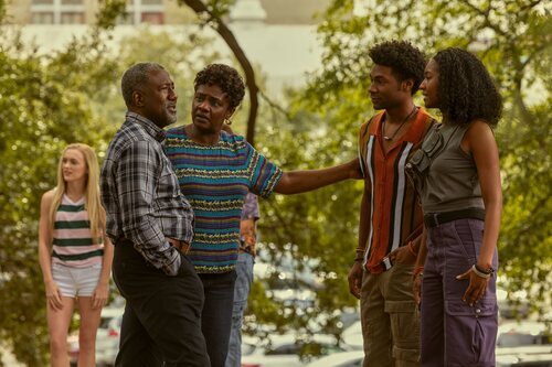 Carlacia Grant, E. Roger Mitchell y J.D. aparecen en una foto promocional del capítulo 'El ayuntamiento' de 'Outer Banks'.
