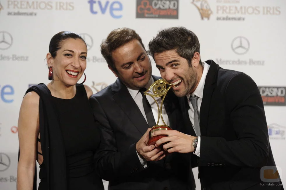 Albert Castillón y Roberto Leal sostienen el Premio Iris 2014 a mejor programa de actualidad por 'Espejo Público'.