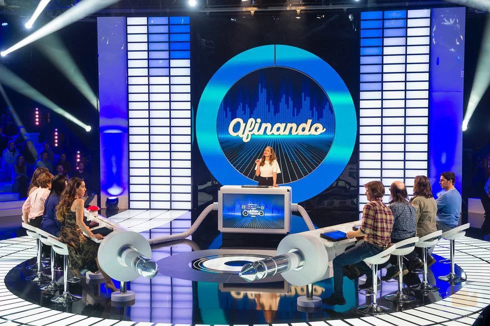 Eva González junto los ocho invitados del primer programa de 'El gran reto musical', el nuevo concurso semanal de La 1 que pondrá a prueba el buen oído de los famosos.