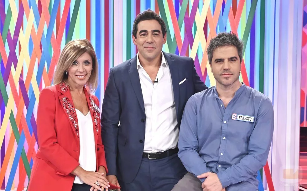 Los actores Eva Isanta, Pablo Chiapella y Ernesto Sevilla en el plató de 'El bribón', el concurso de Mediaset conducido por Chiapella en el que sus compañeros de 'La que se avecina' ejercen de padrinos.